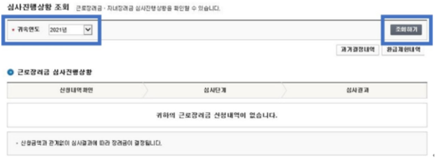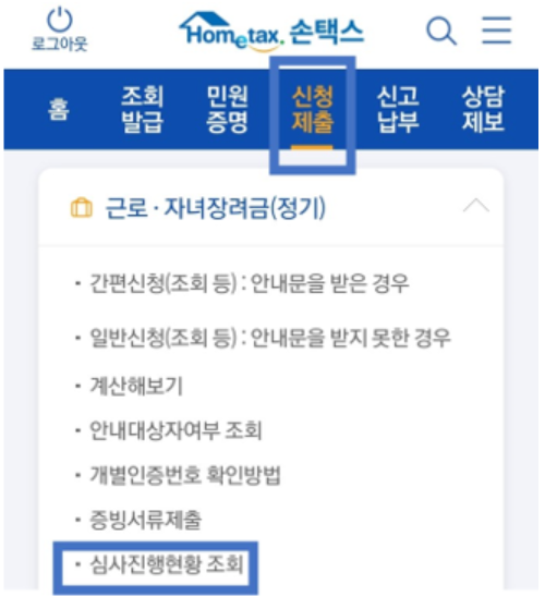② 화면 상단의 '신청제출'클릭 → 근로장려금(정기) - '심사진행현황 조회'클릭