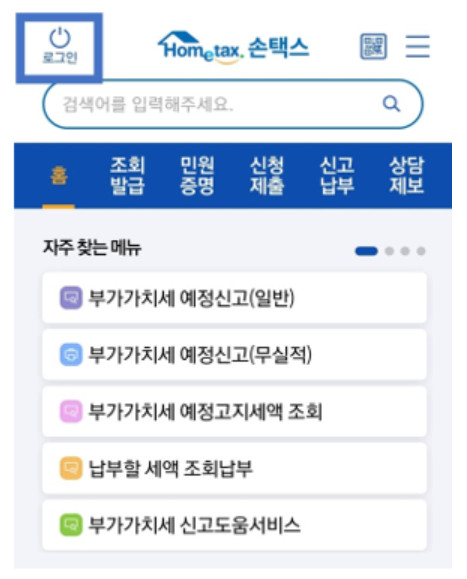 ① 손택스 모바일 어플 설치 후 접속 → 좌측 상단의 로그인 진행