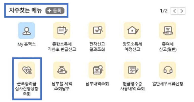 ② 홈페이지 중앙의 '자주찾는 메뉴' → '근로장려금 심사진행상황 조회' 클릭