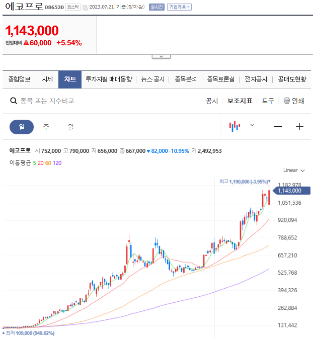 7/21 기준 에코프로 주가는 1,143,000원입니다.