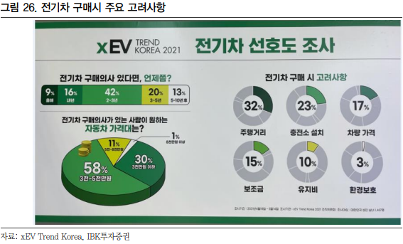 2) 국내 전기차 구매의향에 대한 설문조사 내용입니다. 구매 시기는 2~3년 뒤, 망설이는 이유는 주행거리와 충전소입니다. 주행거리가 늘어나며 충전 횟수가 줄어들고, 충전소가 늘어나 안정적인 충전 인프라가 확보되면 순식간에 전기차로 구매 패턴이 바뀔 것입니다. 국내소비자는 이 시기를 2~3년 후로 전망하는 것 같습니다.