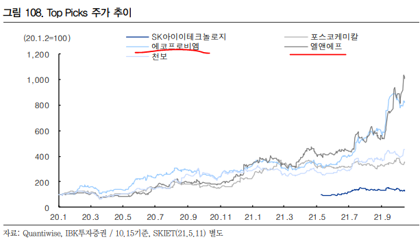 에코프로 비엠과 엘앤에프는 2020년 연초 대비 300~400%가 상승했습니다.