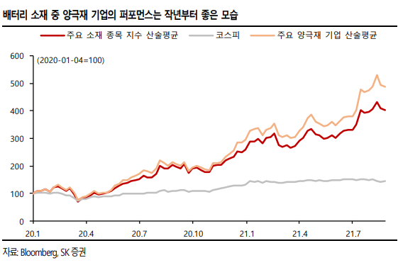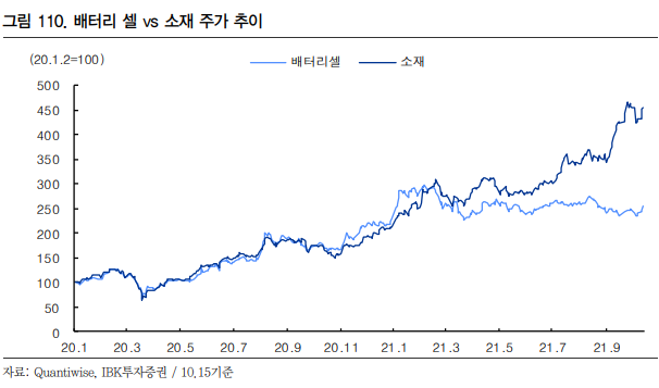 2) 배터리 셀 기업과 소재 기업의 주가를 보면 소재 기업이 먼저 날아가고 있습니다.