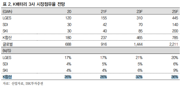 2) 2025년까지 K배터리의 글로벌 점유율은 약 36%로 전망됩니다. 전 세계 전기차 배터리 3개 중에 1개 이상은 K 배터리가 장착됩니다.