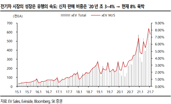 1) 글로벌 전기차 시장은 전망보다 빠른 성장을 보여주고 있습니다. 올해는 작년의 2배 넘는 성장을 보이고 있습니다. 현재 글로벌 신차의 8%는 전기차로 판매되고 있습니다. 신제품이 구제품의 시장을 잠식하며 일명 게임 체인지가 되는 상황은 신제품의 시장점유율이 약 17%에 달하면 폭발적인 시장 개편이 일어난다고 분석되고 있습니다.