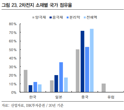 3) 2차 전지 소재별 국가 점유율을 보면 중국이 거의 절반 이상을 점유하고 있습니다. 이는 중국 내 자체 수요와 글로벌 원재료 시장에서 우위에 있기 때문입니다. ETF 선택 시 무시할 수 없는 부분입니다.