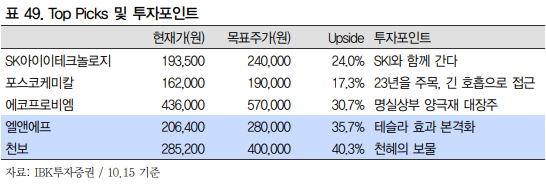 엘앤에프는 설비투자를 위한 유상증자 계획과 시행만으로 7월 대비 100% 이상의 주가 상승이 있었습니다. 2차전지 시장에서 설비투자는 곧 매출 성장과 이익 상승이란 공식이 시장참여자들의 생각입니다.