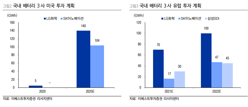 3) 국내 배터리 3사의 투자계획에 미국과 유럽이 있습니다. 향후 시작될 미국 내 전기차 수요에 대응하려는 것입니다. 국내 배터리 3사는 계속되는 투자로 향후 전개될 시장의 배터리 수요를 공급할 예정입니다. 향후 미국에서의 배터리 생산 개시 소식은 지속적인 주가 상승 모멘텀이 될 것입니다.