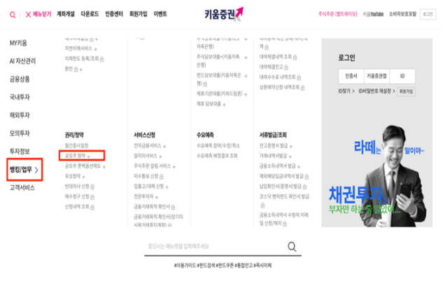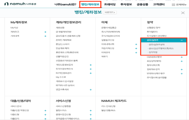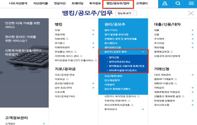 홈페이지 메뉴에서 뱅킹/계좌정보를 선택해 주시면, 공모/실권주라는 카테고리가 나옵니다.