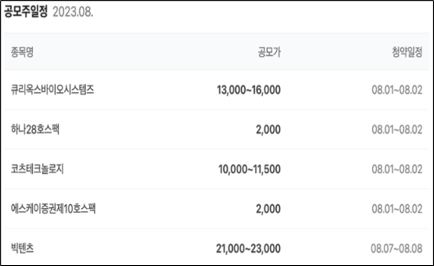 이어서 2023년 8월 공모주 일정을 더 살펴보도록 하겠습니다.