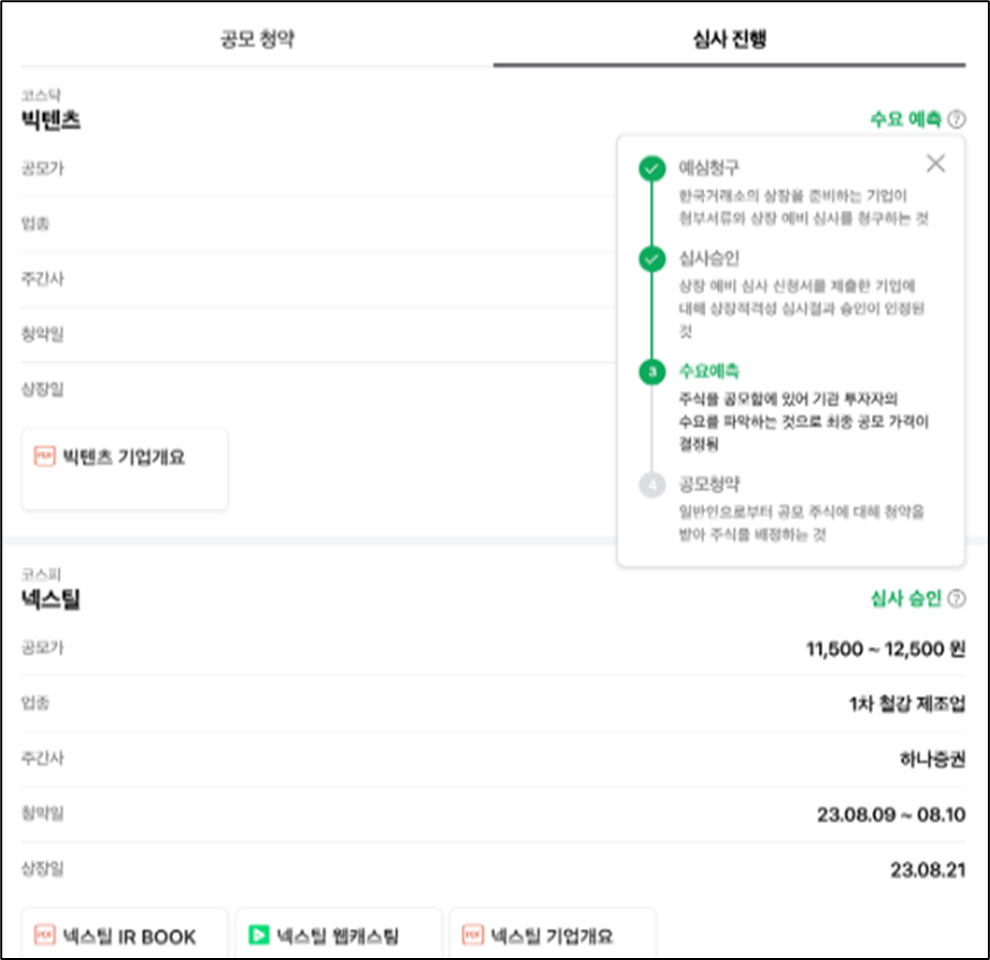 빅텐츠의 경우 코스닥에 상장되며 현재는 수요예측 상태입니다.